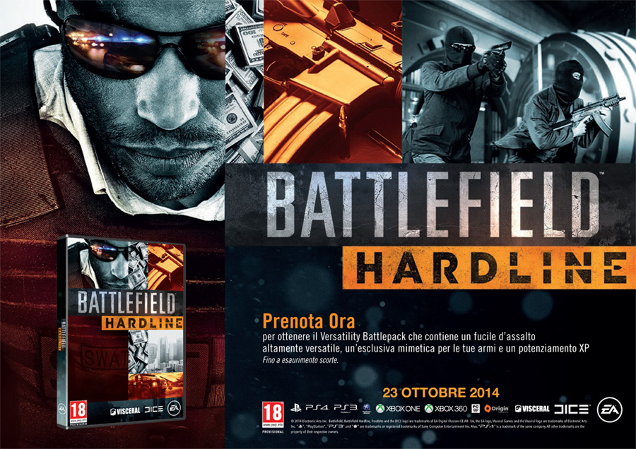 - Battlefield Hardline (Day One 23/10/2014)- Prenota e ricevi il Versatility Battlepack che contiene un fucile d'assalto altamente versatile, un'esclusiva mimetica per le tue armi e un potenziamento XP - clicca qui per vedere il DLC.