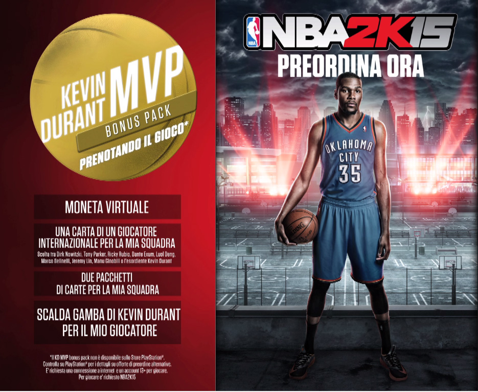 - NBA 2K15 (Day One 10/10/2014) - prenota la Day One Edition contenente il Bonus Kevin Durant - clicca qui per vedere il DLC.