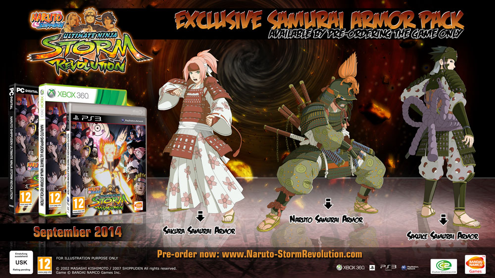 - Naruto Shippuden Ultimate Ninja Storm Revolution (Day One 11/09/2014)- prenota e ricevi il DLC "Exclusive samurai armor pack" che contiene l'armatura da samurai di Naruto, Sasuke, e Sakura - clicca qui per vedere il DLC.