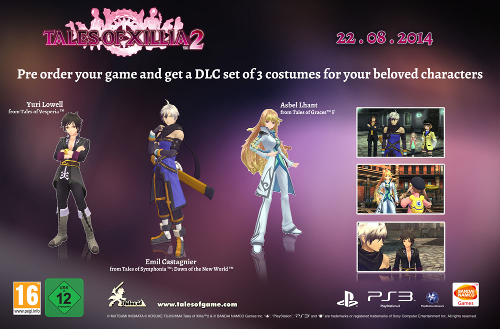 - Tales of Xillia 2 (Day One 28/08/2014) - prenota e ricevi il DLC che include un set di 3 costumi di alcuni dei personaggi più amati: Yuri Lowell di Tales of Vesperia™, Emil Castagnier di Tales of Symphonia™: Dawn of the New World™, Asbel Lhant di Tales of Graces™ - clicca qui per vedere il DLC.
